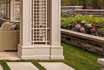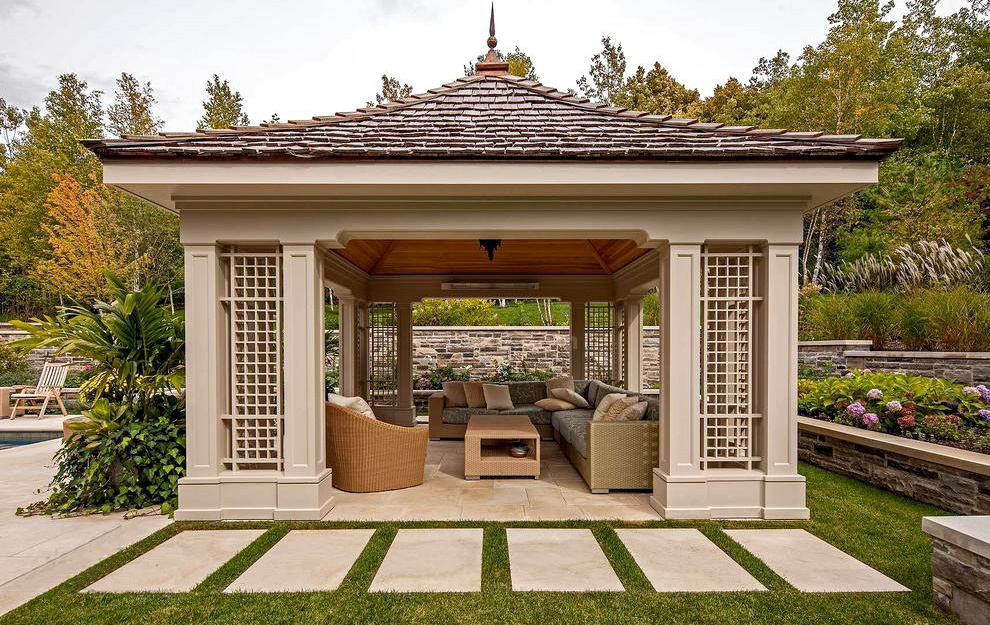 欧式庭院构筑物较复杂,圆柱、雕像、凉亭、观景楼、方尖塔和装饰墙。其中活动长椅被广泛使用,通常由木料制成或不上漆或者涂上一层白漆。
