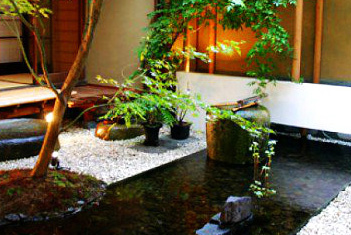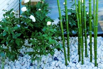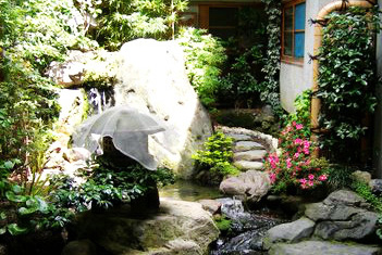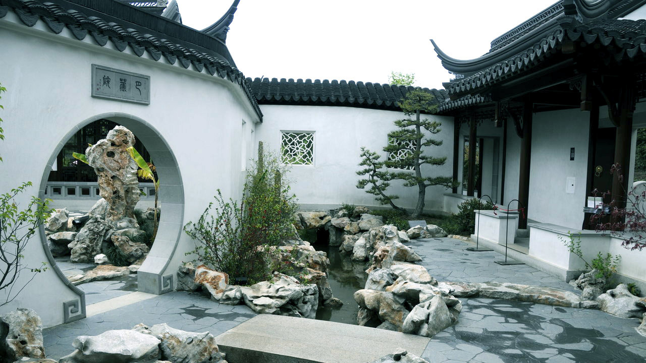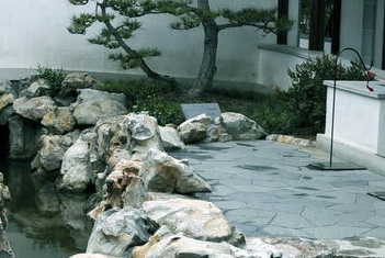 铺地材料采用天然石材、卵石构筑物,中式庭院讲究风水的“聚气”,庭院是由建筑、山水、花木共同组成的艺术品,建筑以木质的亭台、台、廊、榭为主,月洞门、花格窗式的黛瓦粉墙起到或阻隔或引导或分割视线和游径的作用。假山、流水、翠竹、桃树、梨树、太阳花、美人蕉等是必备元素。