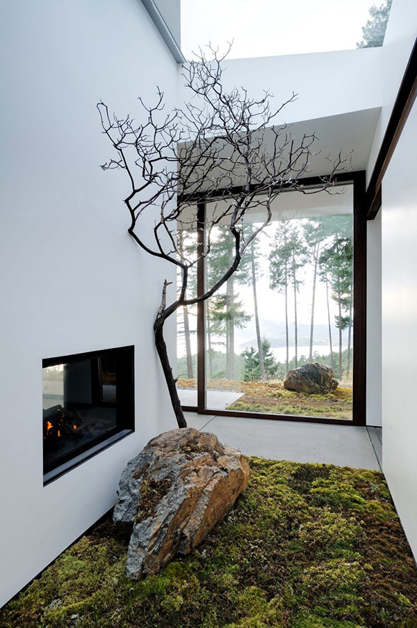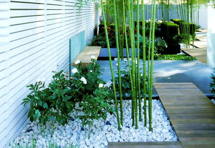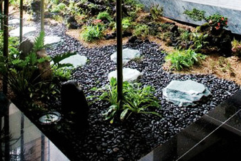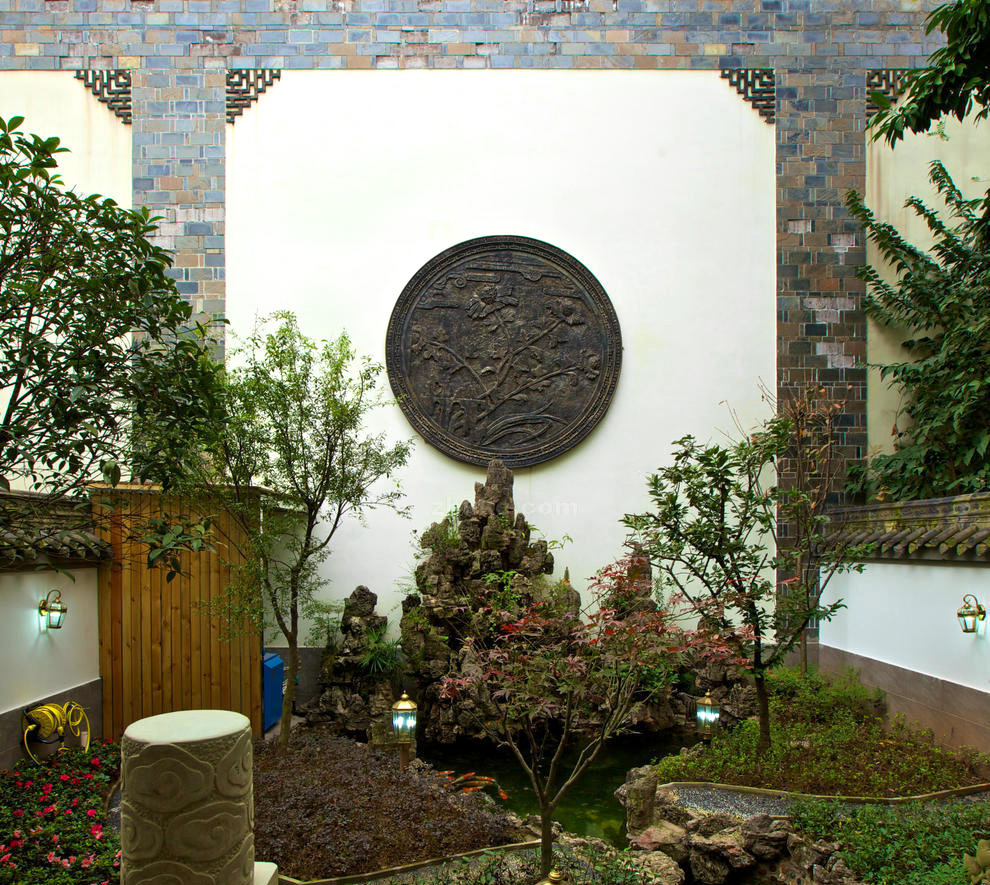 中式庭院色彩应用较中和,多为灰白色。构图上以曲线为主,讲究曲径通幽,忌讳一览无余。