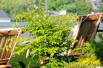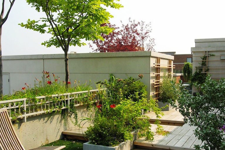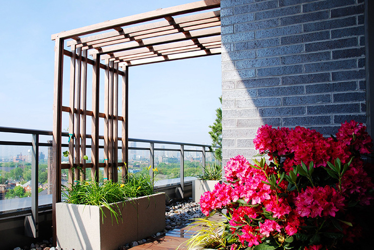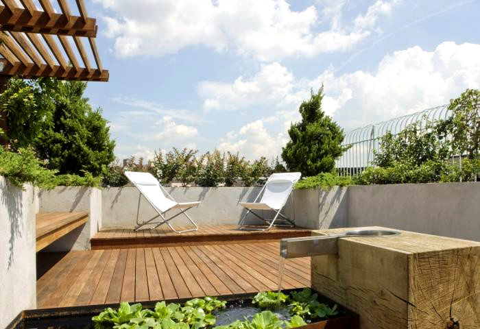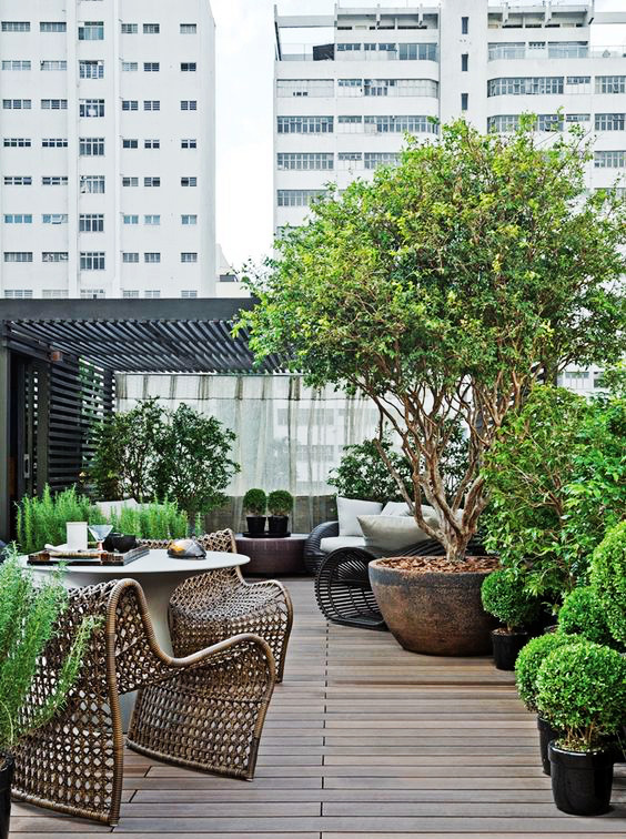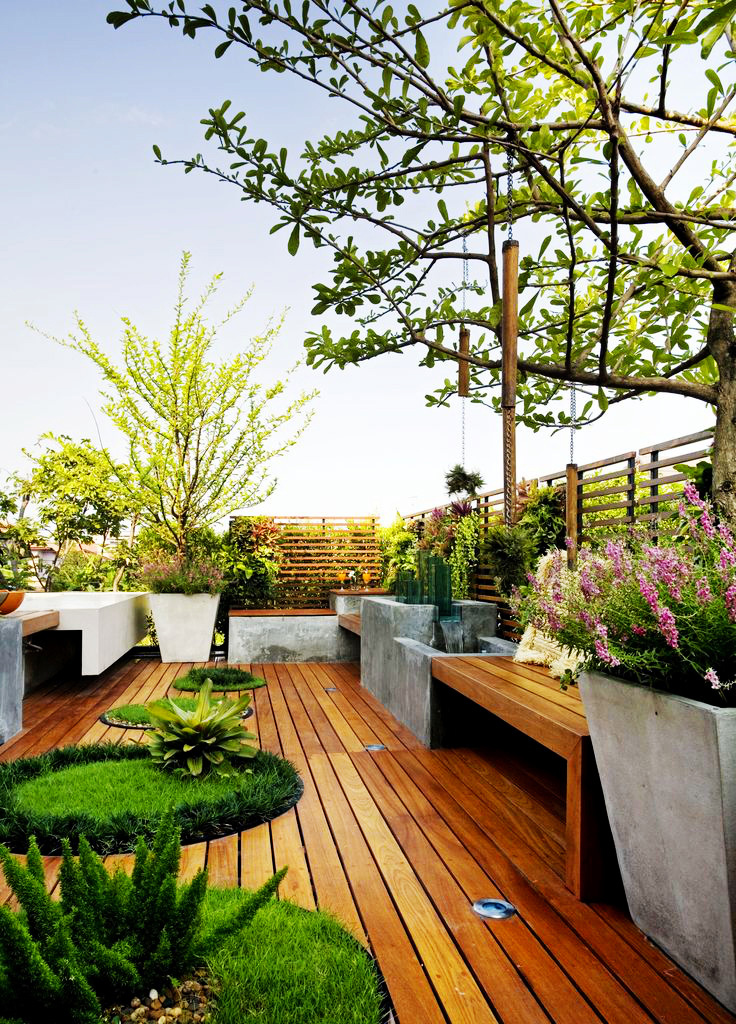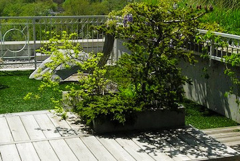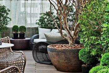 私家屋顶 / 露台花园工程,有别于大型屋顶绿化的设计思路。大型屋顶绿化工程通常要大面积的铺设根阻材料、蓄排水层、分离过滤层、种植基质层、大型树木加固等复杂的工序,建造成本高昂。行嘉景观将花园设计与屋顶绿化技术巧妙的有机的结合在一起,采用大型组合容器种植的模式进行植物绿化,化繁为简,容器里衬以防水防穿刺内胆的形式进行根阻,使得原本复杂繁琐的施工工序变得简单容易,同时也大大降低了屋顶花园的建造成本。 |
